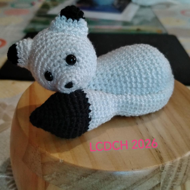 Renard polaire amigurumi couché réalisé au crochet avec passion et amour par mes petites mains.